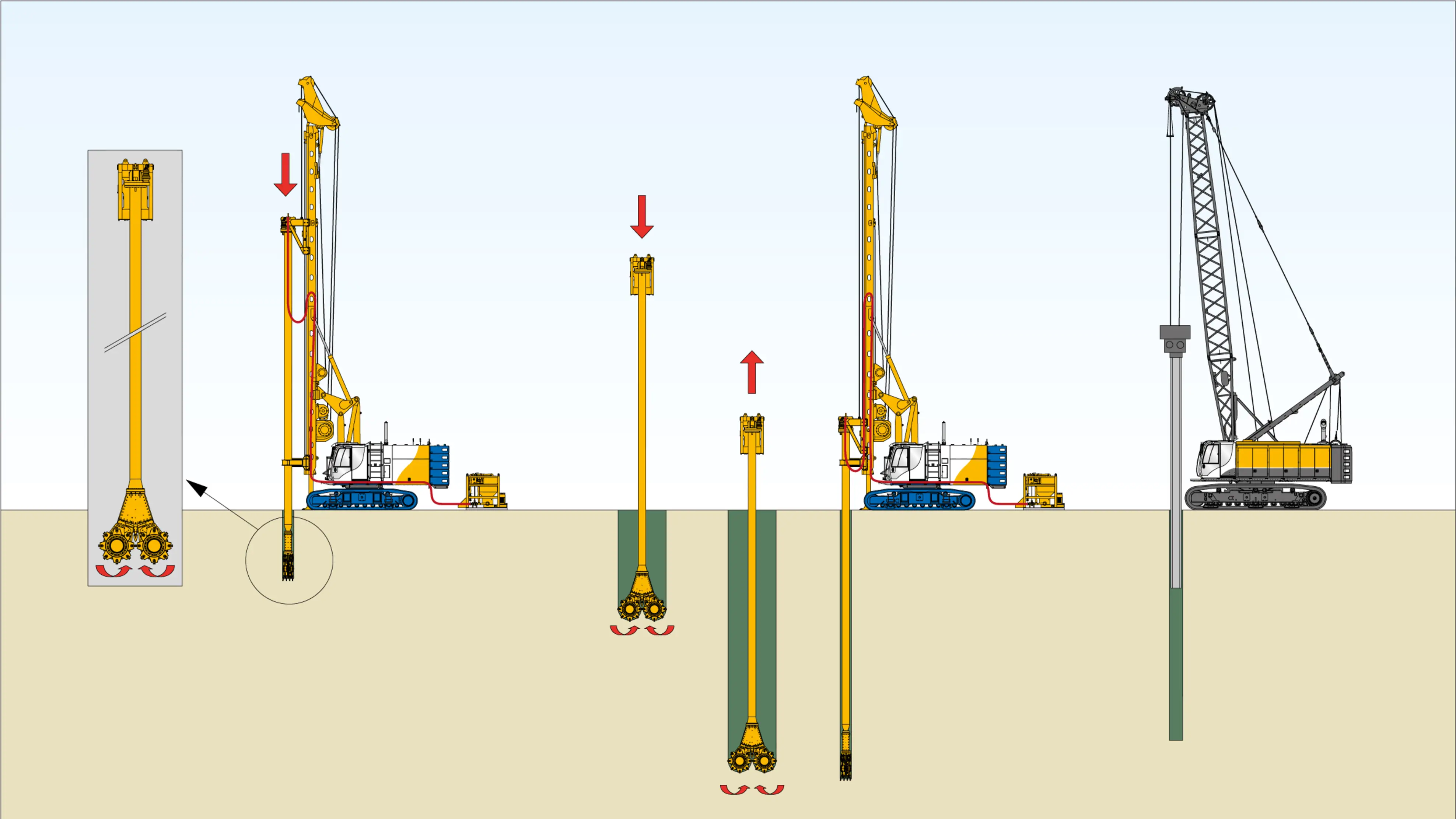 As an enhancement of single column mixing, with the SCM-DH method (DH stands for double head) a double-head drive turns two mixing tool components in reverse direction of rotation. This achieves a particularly intensive mixing of the soil with the slurry. The method is especially suited for the construction of soil mixing columns with larger diameters and in cohesive as well as sandy soils.